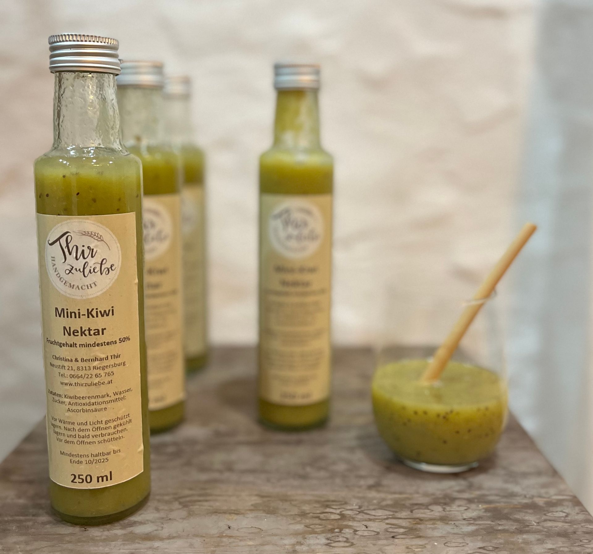 Unser Herz schlägt seit jeher für die Eigenproduktion. Seit 2016 ernten wir auch selbst Getreide vom eigenen Feld. Das besondere Klima und die vulkanländischen Böden lassen sogar exotische Früchte wie die kalorienarme und vitaminreiche Kiwibeere genussvoll reifen. 2017 wurde auch unsere Streuobstwiese gepflanzt. Viele verschiedene alte Apfelsorten wie zum Beispiel Kronprinz Rudolf, Maschanzker, Ilzer Rosenapfel...uvm. wachsen auf einer Fläche von 1,5 ha und können hoffentlich bald zu leckeren BIO Apfelsaft verarbeitet werden. Im Jahr 2020 haben wir außerdem auf einer Versuchsfläche von 0,30 ha Olivenbäume sowie Feigen gepflanzt. Dabei verzichten wir komplett auf Spritzungen und chemische Dünger gemäß den Bio-Austria-Standards. Mit „Thir zu Liebe“ arbeiten und ernten wir mit der Hand und großem persönlichen Einsatz im Einklang mit der Natur. So liegt es in der Natur der Sache, dass es ab der Ernte 2018 Obst in Bio-Qualität gibt – „THIR/DIR und der Natur zu Liebe“!